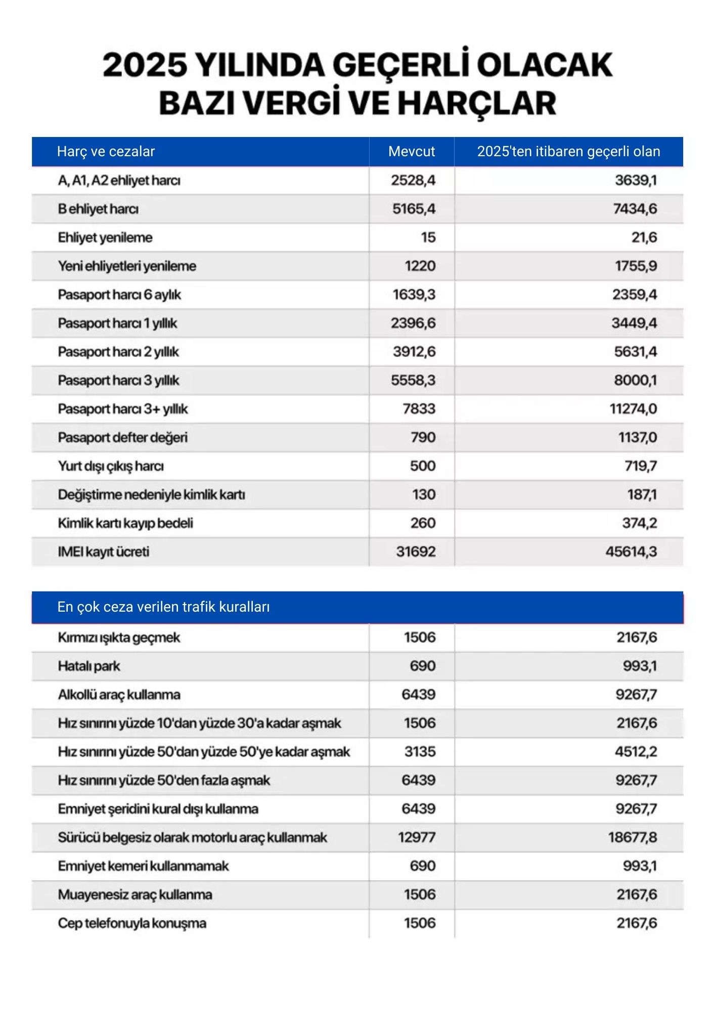 2025 yılına girerken Türkiye'de birçok vergi ve harç kalemi için ciddi artışlar yapılması öngörülüyor. Özellikle IMEI kayıt ücreti, yurt dışı çıkış harcı, Motorlu Taşıtlar Vergisi (MTV) ve pasaport, ehliyet, kimlik gibi resmi belgelerin harçlarındaki yüksek zam oranları, vatandaşların mali planlamalarını doğrudan etkileyecek. İşte 2025'te uygulanması beklenen yeni ücret tarifeleri ve bu artışların vatandaşlar üzerindeki etkileri: