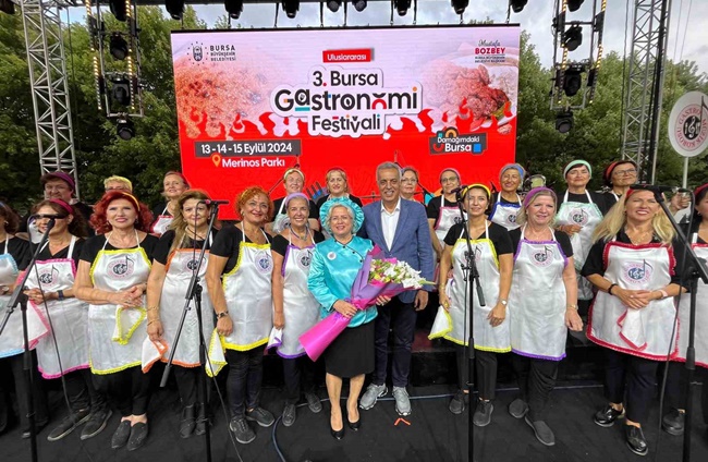 Bursa’nın sahip olduğu zengin mutfak kültürü ve tescilli lezzetleri, bu yıl ’Damağımdaki Bursa’ temasıyla düzenlenen 3. Bursa Uluslararası Gastronomi Festivali’nde bir kez daha vitrine çıktı. Merinos Parkı’nda kentin gastronomi alanındaki potansiyeli gözler önüne serilirken, Bursa’nın duayen sanatçıları Müzeyyen Senar ve Zeki Müren’in isimlerinin verildiği çarşı alanlarında ziyaretçiler farklı lezzetleri tatma imkanı buldu. Bursa Üreten Kadınlar Sokağı’nda kadın dernekleri ve kooperatifleri kendi ürettikleri ürünleri sergilerken, 7 farklı ülkeden 8 yabancı şehir katılım sağladı ve iki yabancı konuk şef festivalde yer aldı. ’Bursa Lezzetleri ve Gastronomi Müzesi’ ile katılımcılar görsel şölen yaşarken, festival yarışmalardan konserlere, dinletilerden eğitimlere, söyleşilerden panellere kadar 54 farklı etkinliğe ev sahipliği yaptı.