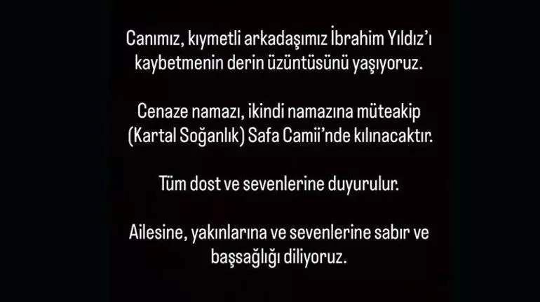 ARKADAŞI ACI HABERİ DUYURDUYıldız'ın vefat haberini meslektaşı ünlü oyuncu Caner Topçu, Instagram hesabından paylaştı. Topçu, sosyal medya hesabında yaptığı paylaşımda; "Canımız, kıymetli arkadaşımız İbrahim Yıldız'ı kaybetmenin derin üzüntüsünü yaşıyoruz. Cenaze namazı, ikindi namazına müteakip (Kartal Soğanlık) Safa Camii'nde kılınacaktır. Tüm dost ve sevenlerine duyurulur. Ailesine, yakınlarına ve sevenlerine sabır ve başsağlığı diliyoruz" ifadelerini kullandı.İBRAHİM YILDIZ KİMDİR?İbrahim Yıldız, 26 Mayıs 1998 tarihinde dünyaya geldi. Sanata olan ilgisi çocukluk yıllarında başladı ve zamanla bu tutku onun hayatının merkezine yerleşti. Eğitim hayatında Güzel Sanatlar ve İç Mimarlık alanlarında aldığı yoğun eğitim, yaratıcılığını ve estetik anlayışını geliştirmesinde önemli rol oynadı. Kamera karşısına ilk kez 2015 yılında çıktı ve bu dönüm noktası onun oyunculuk kariyerinin başlangıcını simgeledi. "Muhteşem Yüzyıl Kösem" dizisinde canlandırdığı Lagari Hasan Çelebi karakteriyle izleyicilerin dikkatini çekmeyi başardı.
