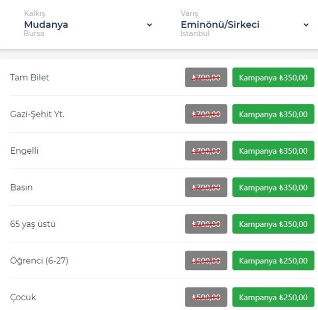 Bursa’nın Mudanya ilçesinden hareket eden deniz araçları, İstanbul’un Eminönü/Sirkeci iskelesine ulaşım sağlıyor. BUDO, 22 Ocak 2024 tarihinde yaptığı zam ile fiyatları 230 lira olarak açıkladı. Bu fiyatların üzerine yüzde 52’lik artış ile biletler 350 liraya çıkarıldı.