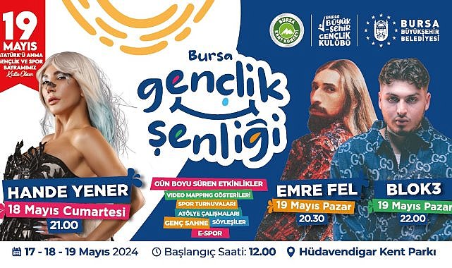 18 Mayıs Cumartesi günü ve 19 mayıs Pazar günü ise Balat Ormanı Paintball alanı, Atatürk Kent Ormanı dağ kızağı aktivitesi ve Mihraplı Parkı’ndaki etkinliklerle 19 Mayıs coşkusu devam edecek. Mihraplı Parkı’ndaki alanda, Atatürk ve 19 Mayıs sergisi, skatepark, tenis, mini futbol, basketbol 3x3 turnuvası, tırmanma duvarı, kano yarışması, ‘gülümse çekiyorum’ fotoğraf alanı, karaoke alanı, açık hava sineması, Redbull F1 similasyonu, Redbull oyun çadırları, su perdesi mappıng, 50 adet gençlik standı, e-spor alanı, retro oyun alanı, gülümseyen sahne, grafiti alanı, fikir duvarı, 360 fotoğraf alanı, bayrak dağıtım noktası, dart turnuvası, 3d kalem, model maket yapımı, teleskop gözlemi, led anahtar atölyesi, VR gözlük atölyesi, 3D printer deneyimleme, ahşap atölyesi, sumo güreşi oyunu, canlı langırt, zıpla yapış, dev jenga, slot car araba yarışı, mini masa tenisi, bileklik atölyesi, karikatür atölyesi ve karizma basketbol show gibi birçok etkinlik alanı yer alacak. Cumartesi günü Saat 21.00’da ünlü şarkıcı Hande Yener’in, Pazar günü ise Saat 20.30’da ünlü isim Emre Fel’in, Saat 22.00’da Blok3’ün Hüdavendigar Mihraplı Kent Parkı’nda sahne almasıyla coşku doruğa çıkacak.