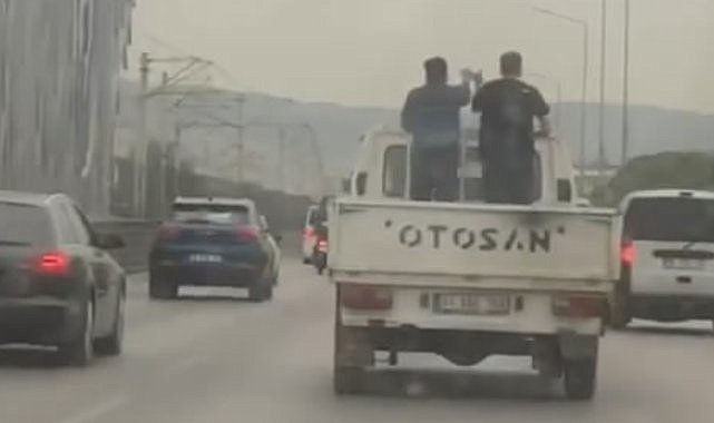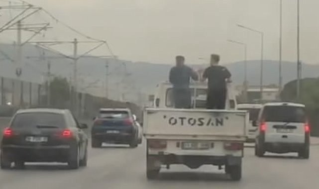 Bursa'da iki arkadaşın seyir halindeki kamyonetin kasasındaki tehlikeli yolculuğu yürekleri ağza getrdi. O anlar amatör kameraya yansıdı.