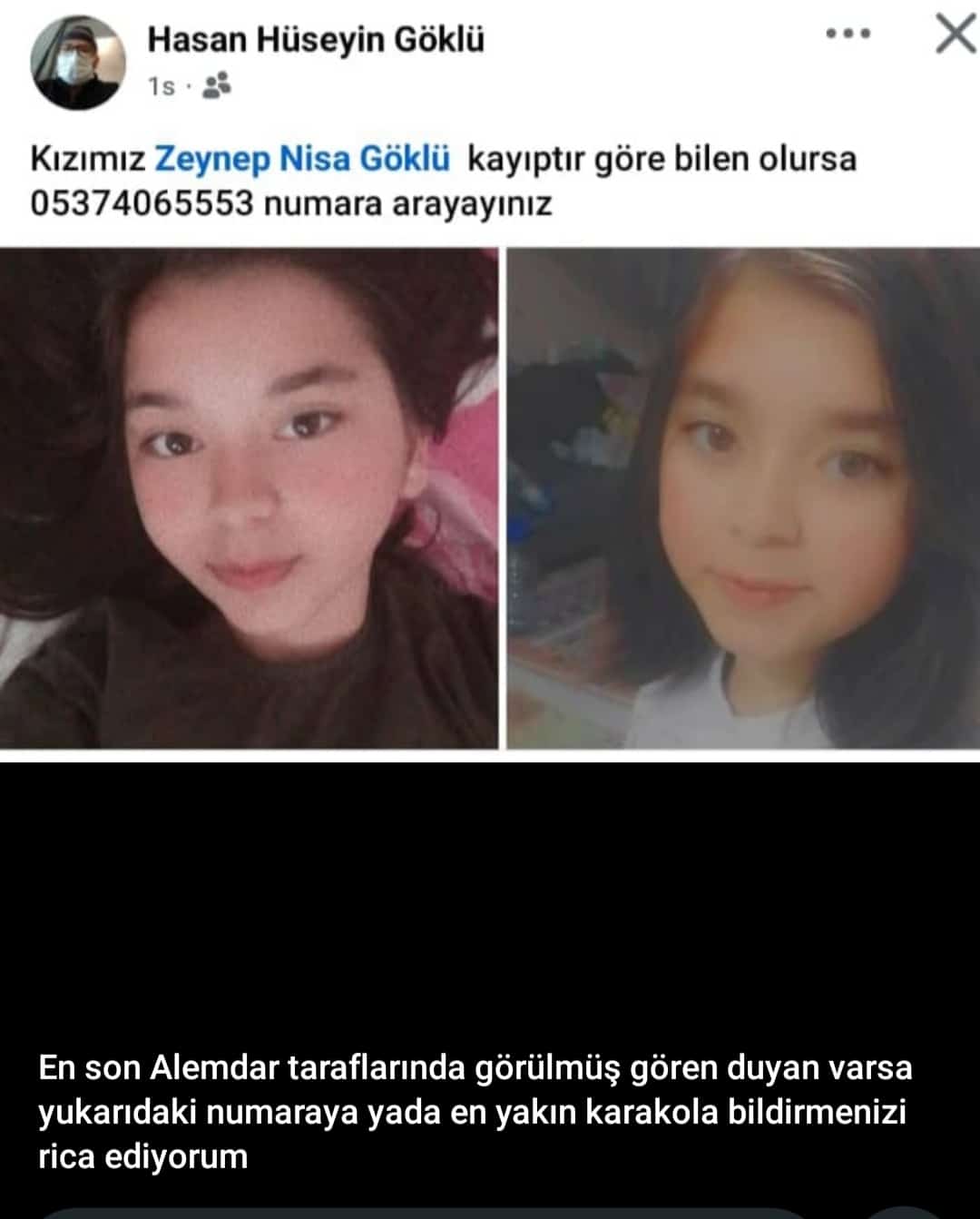 Günlerdir kendisine ulaşılamayan Zeynep Nisa Göklü için baba Hasan Hüseyin Göklü sosyal medyadan sesini duyurdu. Kendisinin en son Alemdar bölgesinde görüldüğünü belirten baba Göklü, bu bölgelerdeki vatandaşların kızlarını görmesi halinde telefon ile haber vermesini rica etti.