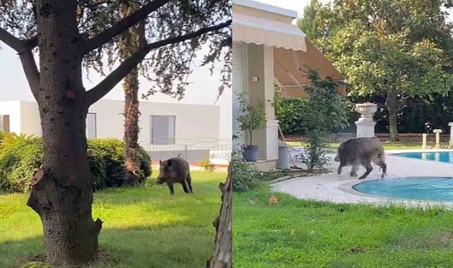 Bursa'nın merkez ilçelerinden Nilüfer'e bağlı Bademli Mahallesi'nde bir villanın bahçesine giren domuzun görüntüleri kaydedildi.