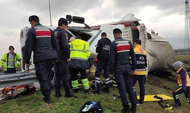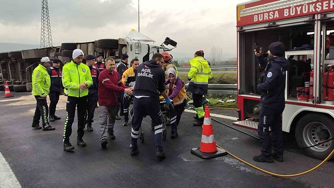 Kaza, Bursa'daki Gebze-Orhangazi-İzmir otoyolunda meydana geldi. Edinilen bilgiye göre, Orhangazi kavşağında virajda kontrolden çıkan rulo halinde plastik kapı fitili yüklü bir tır devrildi. Tır içinde sıkışın sürücü, bölgeye gelen itfaiye ekiplerince çıkartıldı. Yaralı sürücü olay yerinde yapılan ilk müdahalenin ardından hastaneye kaldırılırken, kazayla ilgili soruşturma başlatıldı.