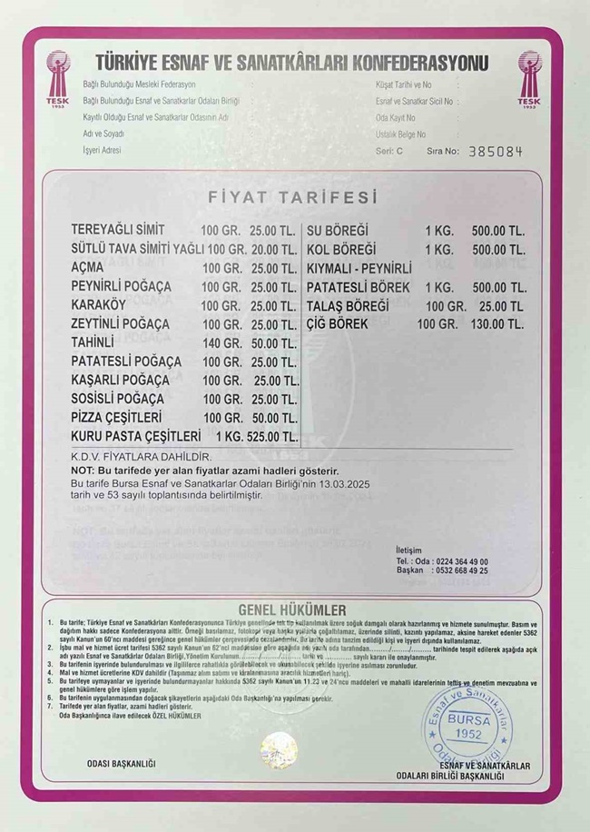 Bursa Simitçiler ve Unlu Madde İmalatçıları Esnaf ve Sanatkarlar Odası, yeni fiyat listesini açıkladı. Ham madde, doğal gaz, kira ve personel giderleri sebebiyle zam yapıldığı belirtildi. Yapılan zammın ardından 100 gram poğaça 20 liradan 25 liraya, 100 gram tereyağlı simit 20 liradan 25 liraya, 100 gram sütlü simit 15 liradan 20 liraya yükseldi. Bursa Simitçiler ve Unlu Madde İmalatçıları Esnaf ve Sanatkarlar Odası Başkanı Erdal Pınar, "Yaklaşık 8 aydır bizim esnafımız zam yapmıyor. Normal şartlarda ocak ayında zam yapılması gerekiyordu. Vatandaşlarımızı da düşünerek 4 ay gecikmeli bu zammı uyguladık. Esnaf kurtarmaz hale geldiği için bu zammı yapmak zorunda kaldık. Çünkü personelinden ununa, şekerinden doğal gazına kadar maliyetler arttı. Bunlar yükseldiği için esnafımızın ayakta durması için yüzde 25 zam yaptık. 8 ayda yüzde 25 zam normaldir. İnce eleyip sık dokuduk. Kazan simidine ise zam yapmadık. Halen 100 gram kazan simidimiz 15 liradan satılmaktadır" dedi.