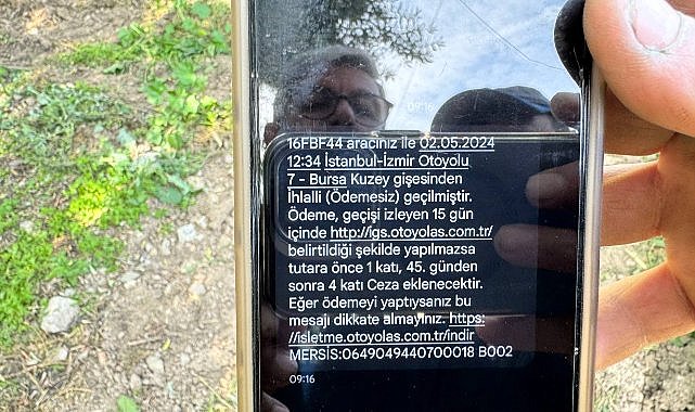 Bursa’nın İznik ilçesinde çiftçilikle uğraşan 43 yaşındaki Yahya Okkalı geçtiğini günlerde telefonuna gelen '16 FBF 44 aracınız ile 02.05.2024 İstanbul İzmir otoyolu ihlali (ödemesiz) geçilmiştir. 15 gün içinde ödeme yapılmazsa bir katı, 45 gün sonra ise 4 katı ceza eklenecektir.' mesajla şoku yaşadı.Kendisinin hiç bir zaman otobana girmediğini belirten Okkalı, ne yapacağını kara kara düşünmeye başladı.