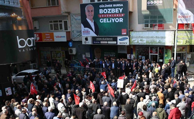 Cumhuriyet Halk Partisi (CHP) Bursa Büyükşehir Belediye Başkan Adayı Mustafa Bozbey, Osmangazi ilçesi Emek Mahallesi’nde seçim ofisi açılışına katıldı. CHP İl Başkanı Nihat Yeşiltaş, Milletvekili Orhan Sarıbal, CHP Osmangazi İlçe Başkanı Cengiz Çelikten ve CHP Osmangazi Belediye Başkanı Erkan Aydın’ın da katıldığı açılış törenine vatandaşların ilgisi yoğundu.