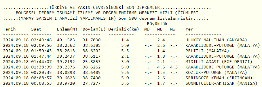 18 Eylül 2024 tarihinde, saat 01.38'de merkez üssü Malatya'nın Pütürge ilçesi olan 4,4 büyüklüğünde bir deprem meydana geldi. Afet ve Acil Durum Yönetimi Başkanlığı (AFAD) tarafından yapılan açıklamaya göre, depremin derinliği 5 kilometre olarak ölçüldü.